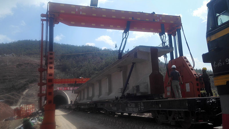 雙線倒裝龍門架是一種跨雙線的梁片或軌排的倒裝龍門架,它可在平車和炮車之間通過橫移方式實現(xiàn)梁片或軌排的吊裝。既適用于雙線倒裝,也適用于單線倒裝。支起時內(nèi)部空間可通過機(jī)車。運(yùn)輸時滿足限界要求。倒裝龍門架主要由增高節(jié)、底架總成、柴油發(fā)電機(jī)、液壓系統(tǒng)、電控系統(tǒng)、導(dǎo)向柱組成、升降機(jī)構(gòu)、護(hù)架組成、起重梁、橫移機(jī)構(gòu)、吊繩裝置、油缸總成等部分組成。